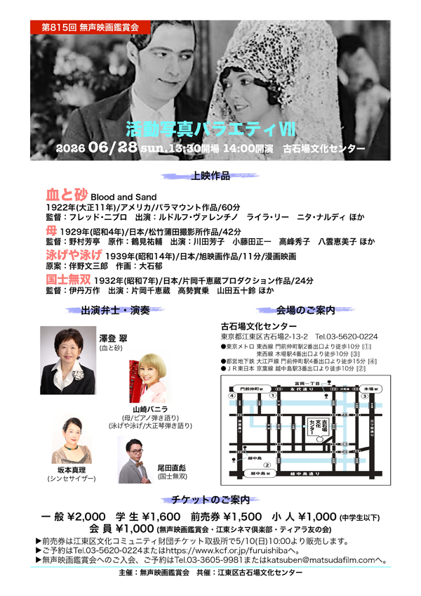 ※E-mail予約の場合は、「○月○日無声映画鑑賞会前売予約」、枚数、代表者のお名前を明記して、メールをお送り下さい。