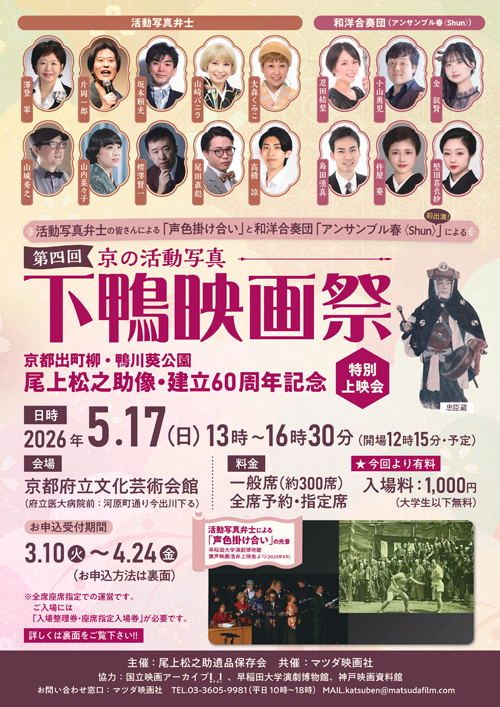 | 『忠臣蔵 天の巻 地の巻 人の巻』 大正15年 日活作品 監督/池田冨保 出演/尾上松之助、山本嘉一、河部五郎 弁士/澤登翠ほか弁士10名による声色掛け合い |