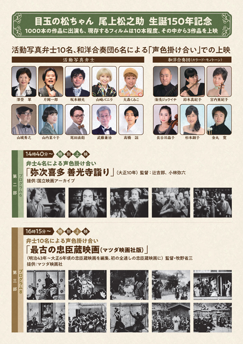 『忠臣蔵』 76分 昭和14(1934)年 旭映画作品 明治43~大正6(1910~1917)年 横田商会ほか作品 監督/牧野省三 出演/尾上松之助、片岡市之正 弁士/澤登翠ほか弁士10名による声色掛け合い |