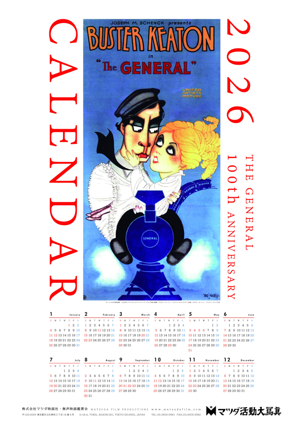 今年のカレンダーは、三大喜劇王のひとりバスター・キートンの代表作『キートン将軍(大列車追跡)』の製作100年を記念して当時のポスターをデザイン致しました。