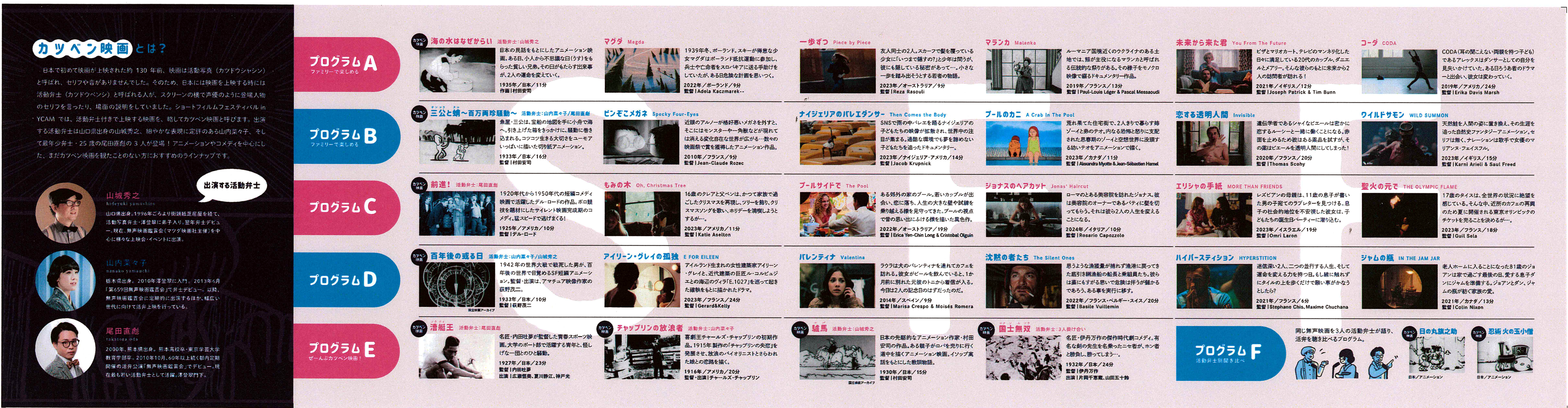 活弁界のレジェンド澤登翠は、時代を彩ったスターが主演を務めた名作『伊豆の踊子』の第一回映画化作品、田中絹代主演の『恋の花咲く伊豆の踊子』、先頃、芸術選奨新人賞を受賞した人気弁士坂本頼光は片岡千恵蔵主演の『放浪三昧』、『ゆきてかへらぬ』や『BAUS』にも弁士役で登場している実力派片岡一郎は現存最古の『怪談皿屋敷』と2005年制作の新作無声映画『クトゥルフの呼び声』、唯一無二の弾き語り弁士の山崎バニラはなんとアニメも自作!『蒲田モダンことはじめ』と高峰秀子のデビュー作『母』、関西の人気弁士大森くみこはテイラー・スイフトの楽曲で再注目、伝説のスタークララ・ボウ主演の『恋人強奪』、澤登門下の山城秀之と山内菜々子は一門の始祖染井三郎が一世を風靡した『アントニーとクレオパトラ』の説明の挑戦。初参加のベテラン麻生八咫・子八咫は親子掛合いで日米爆笑喜劇の2本立て『チャップリンの番頭』と『子宝騒動』。また、今年はゲスト弁士として映画通のフリーアナウンサー笠井信輔と茅原ますみ夫妻が登場!