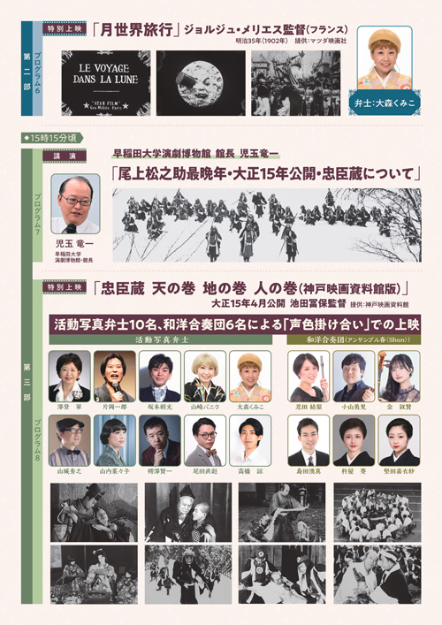 映像×語り×音楽が三位一体となった活動大写真の魅力、個性豊かな人気弁士の競演、朝から晩までカツベン三昧の一日をお楽しみ頂きます。どうぞご期待下さい!