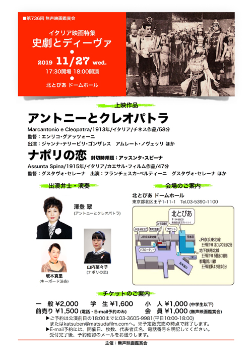 ※E-mail予約の場合は、「○月○日無声映画鑑賞会前売予約」、枚数、代表者のお名前を明記して、メールをお送り下さい。